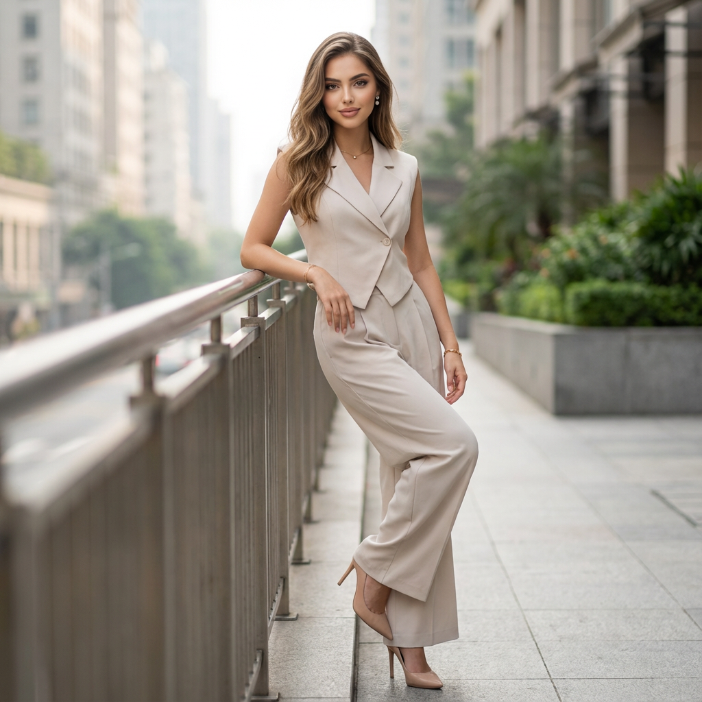 Featuring a sleeveless top with turn-down collar paired with full-length wide-leg trousers, this set offers a balanced straight fit with a mid-waist silhouette.
