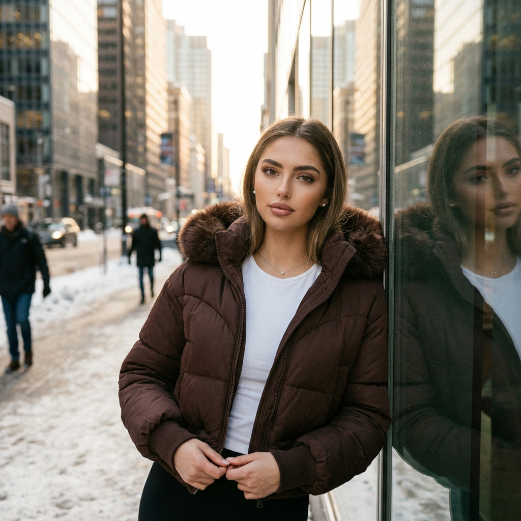 This women’s winter jacket features a warm cotton-blend shell with white duck down filling, designed to keep you comfortable through colder days.