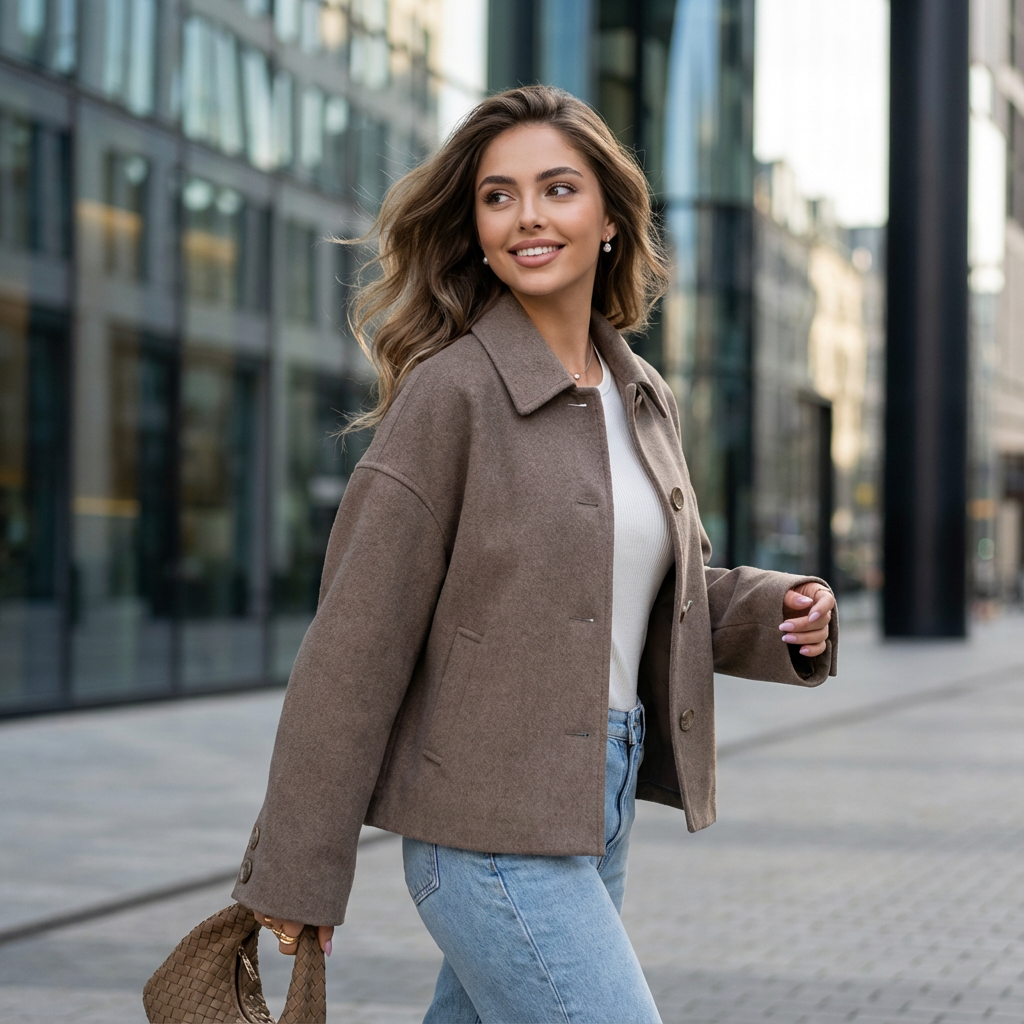 This women’s short denim-style jacket features a modern patchwork design with a clean turn-down collar and full-length sleeves, delivering a confident High Street look. Crafted with a standard-weight fabric, it’s ideal for layering through Autumn and Winter, while still comfortable enough for transitional weather.