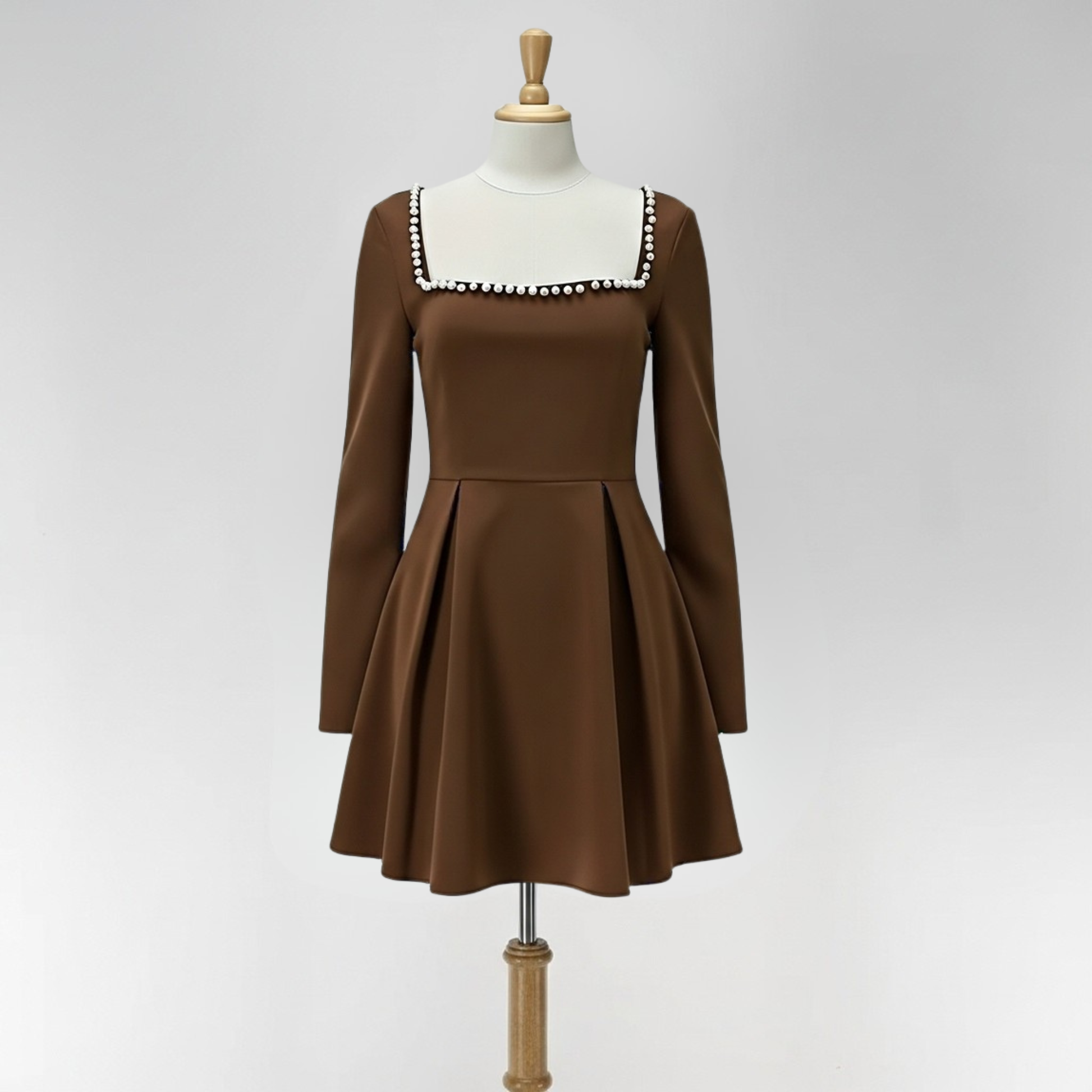 Meet the Pearl Square Collar Elegant A-Line Mini Dress — a beautifully refined piece that blends sophistication with effortless charm. Designed with a structured pearl-trim square neckline, full sleeves and a flattering A-line silhouette, this dress delivers a polished, feminine look perfect for parties, dinners and special evenings out.