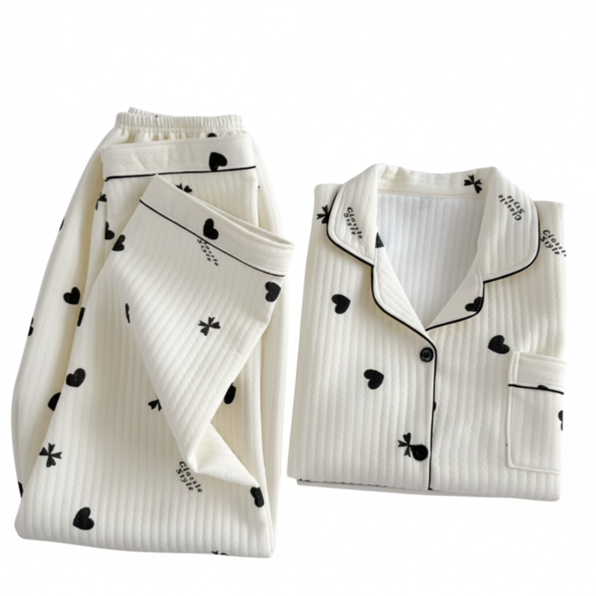 With its cute minimalist pattern, round neck long-sleeve top, and relaxed-fit trousers, this is the perfect winter sleepwear — ideal for lounging, relaxing, or enjoying a cosy night in.